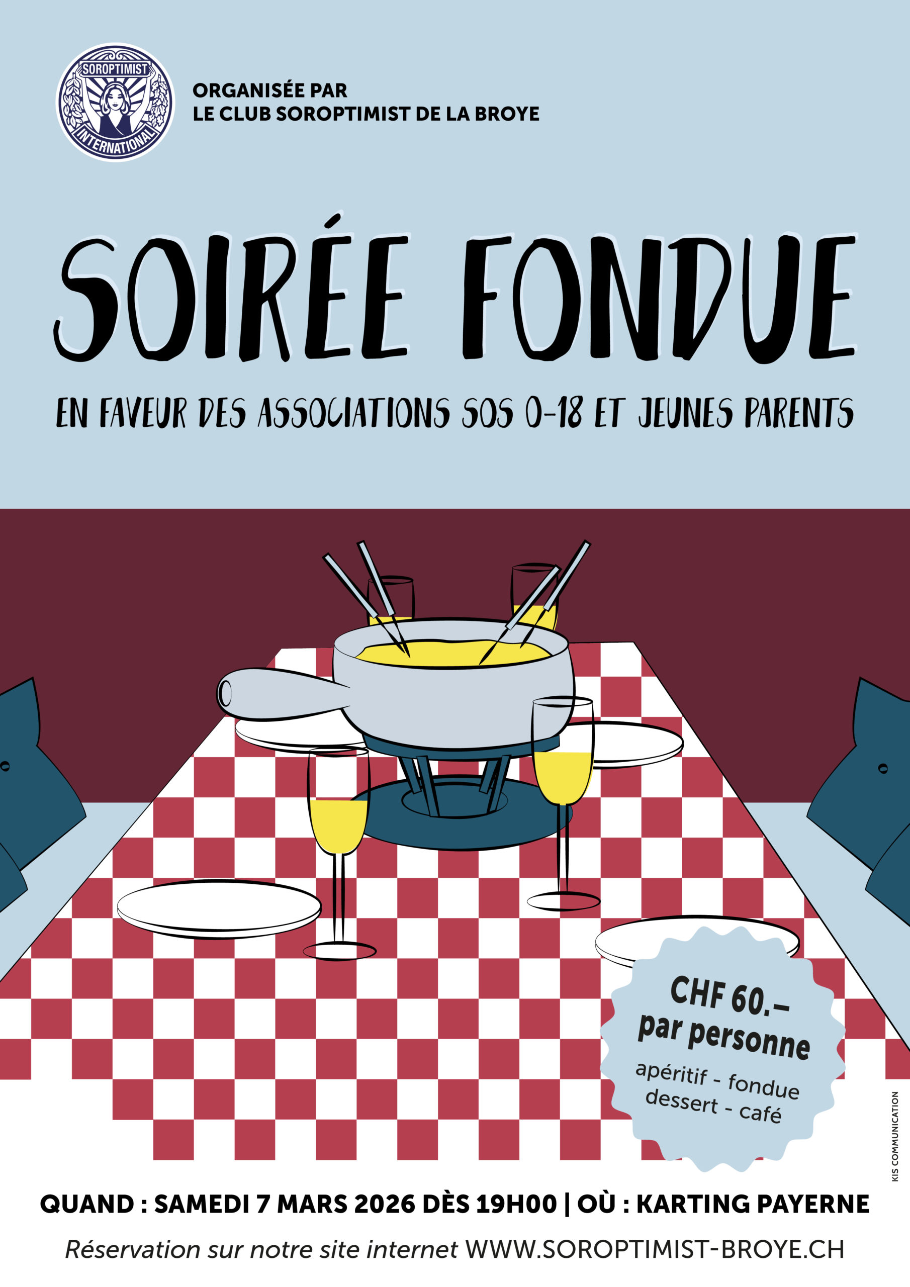 Le Club Soroptimist de la Broye organisera sa traditionnelle soirée fondue le samedi 7 mars 2026 au karting à Payerne. Cette année, les dons seront destinés à deux associations : SOS 0-18 et JeunesParents.